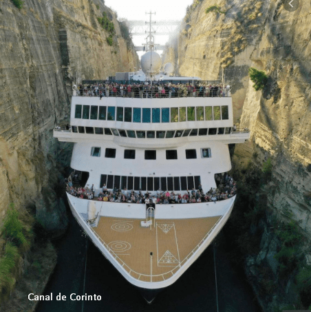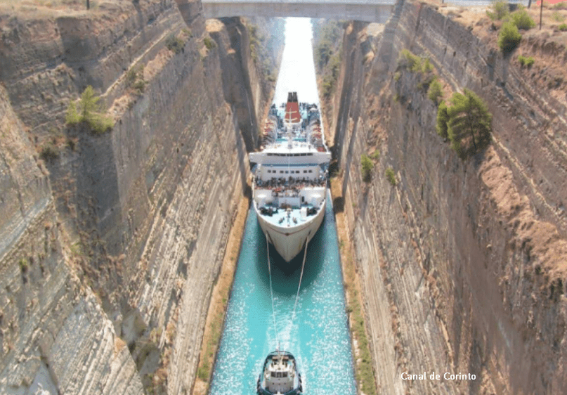 Se trata de una estrecha vía de agua artificial construida finalmente el año 1893 en el punto mas estrecho de Grecia continental uniendo los dos principales mares del país el mar Egeo y el mar Jónico, evitando la vuelta de 400 kilómetros alrededor de la península del Peloponeso.