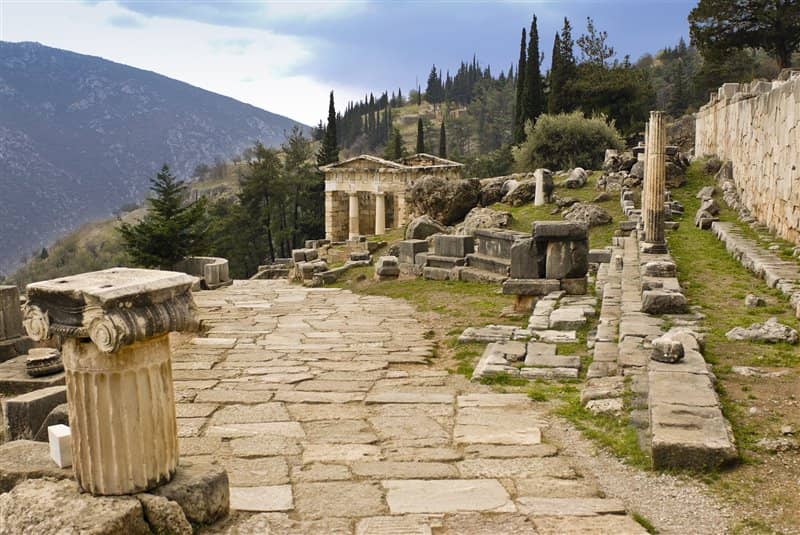 Es el camino que recorría la mayor parte del santuario hasta llegar al punto más sagrado que era el templo de Apolo, comenzaba desde un espacio con pórticos llamado ágora donde se podía comprar objetos religiosos, además todo el camino estaba pavimentado con losas de la piedra local. La vía sagrada estaba flanqueada por los tesoros , construidos por las ciudades-estados que le daban un aspecto monumental.